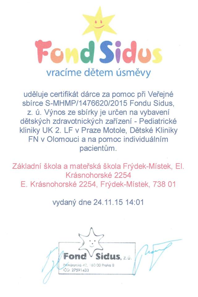 tato ZŠ zapojila a oslovila nadační fond sidus o finanční dar pro našeho syna Lukáška. Fond sidus daroval finanční čásku 20.000,- NA KLIM-THERAPY v lázních KLIMKOVICÍCH.
